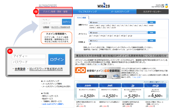 02. サイト上部のメニューから「ドメイン取得・更新・管理」をクリックします。