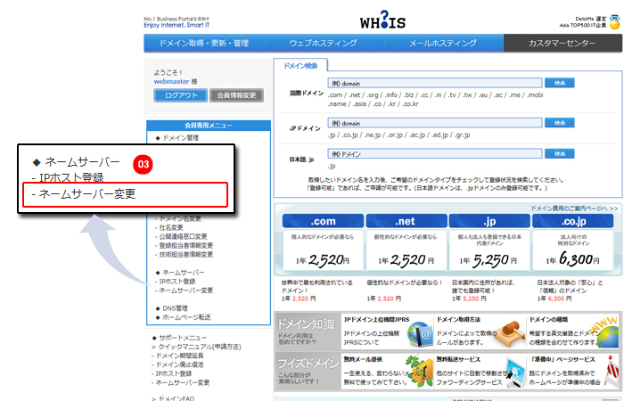 04. ネームサーバーの変更を行なうドメインタイプのタブをクリックしてください。