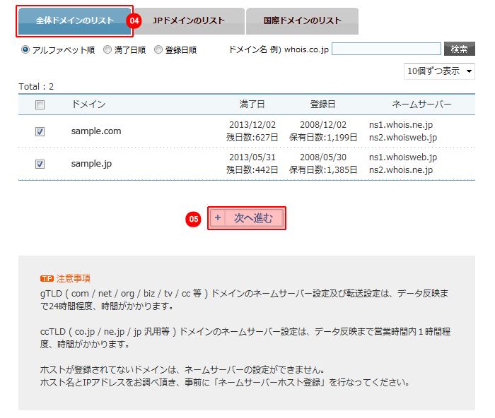 05. ネームサーバーの変更を行なうドメインのチェックボックスを選択して「次へ進む」ボタンをクリックしてください。