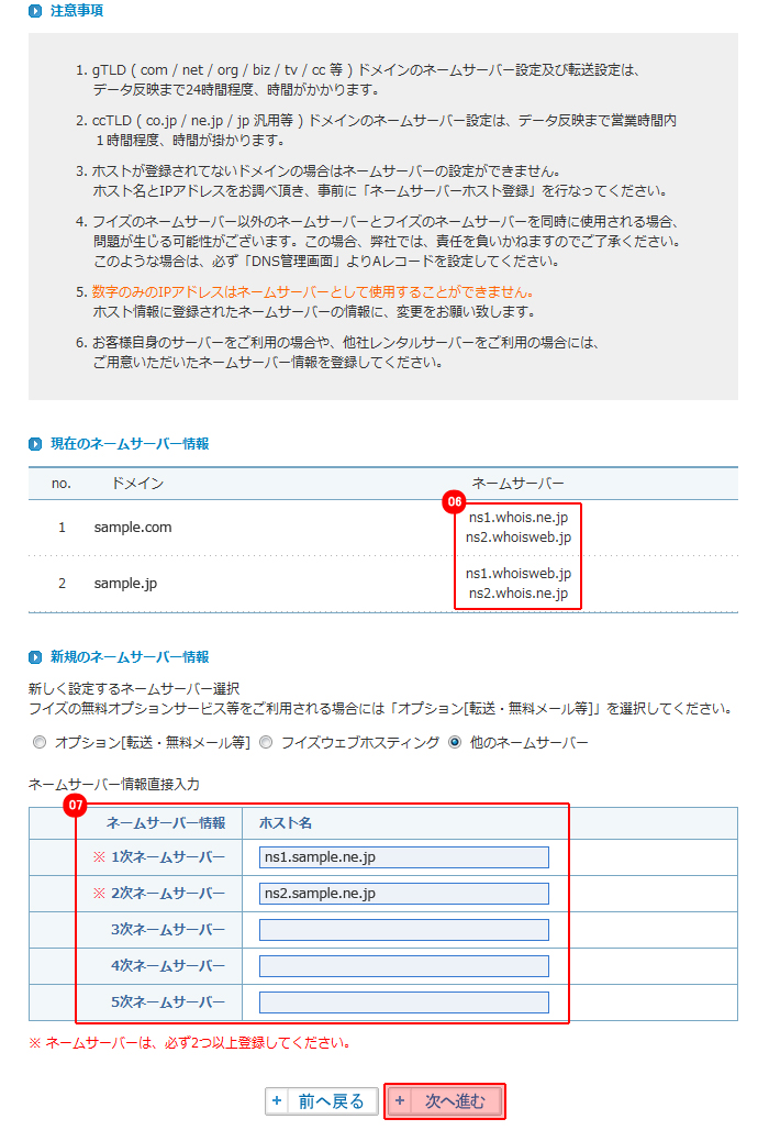 07. 変更するネームサーバー情報を入力して、「次へ進む」ボタンをクリックしてください。