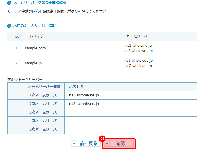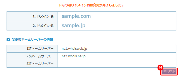 09. 「リスト」ボタンをクリックすると、ネームサーバー変更リスト画面へ戻ります。