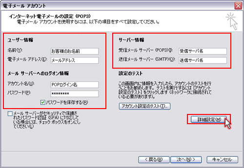アカウントの設定を入力して、[詳細設定]をクリックします。