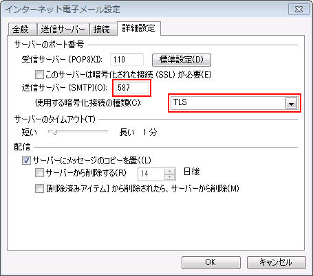 「詳細設定」タブの 送信メールサーバ(SMTP)のポート番号を確認します。