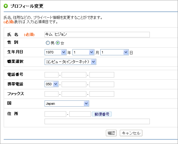 名前及び、個人新情報を入力した後、[確認]をクリックすると、個人情報変更が完了されます。