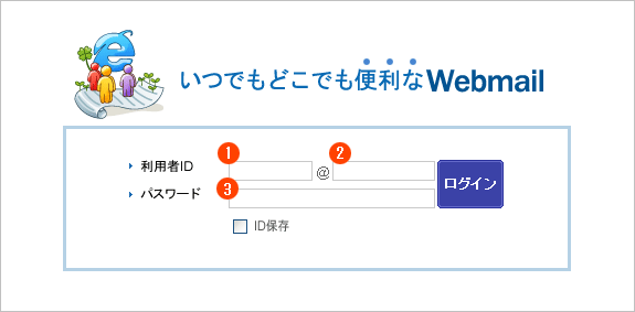 ① 利用者ID メール管理者が設定したIDを入力してください。 ② メールドメイン メールを使用するドメインを入力してください。(例: whois.co.jp) ③ パスワード 該当メールアカウントに設定されているパスワードを入力してください。 ※ 「ID保存」をチェックすると、ID@ドメインが保存され接続する度に入力する必要がありません。