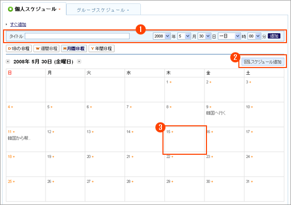 個人スケジュール、グループスケジュールを追加して、スケジュール管理することができます。