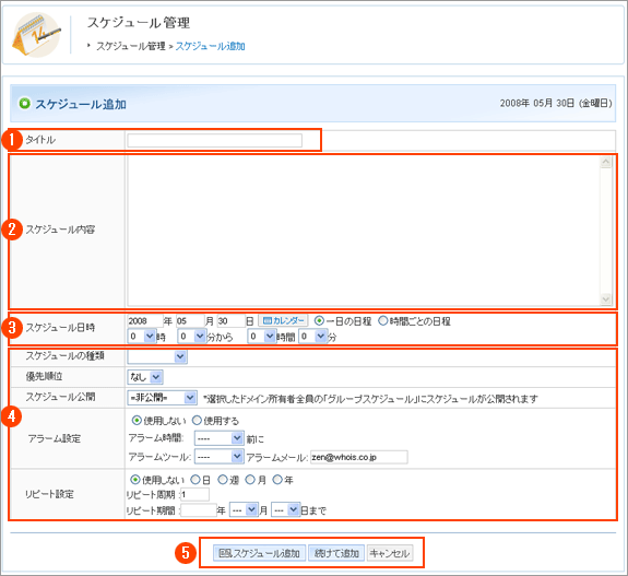 - スケジュール追加:入力したスケジュールを追加して、スケジュール管理メイン画面に戻ります。
