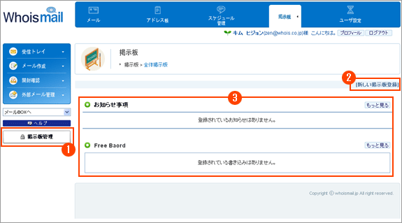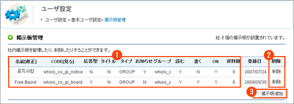 ① 掲示板設定確認 現在作成されている掲示板の名前と各掲示板の設定を確認することができます。